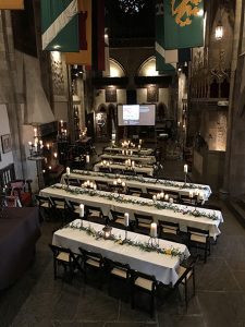 The Great Hall was candle-lit and decorated with flowers by Co-Sponsor, All Purpose Flowers. Co-Sponsor, Cape Ann Brewery donated the meal (medieval turkey legs) and beer. Co-sponsors, Dogtown Restoration and Aflac donated non-alcoholic beverages. A special thank you to Seaside Legal Solutions for offering a helping hand in the set up and break down. All invitees received a commemorative pint glass which says “I stood my watch at Hammond Castle Museum.”